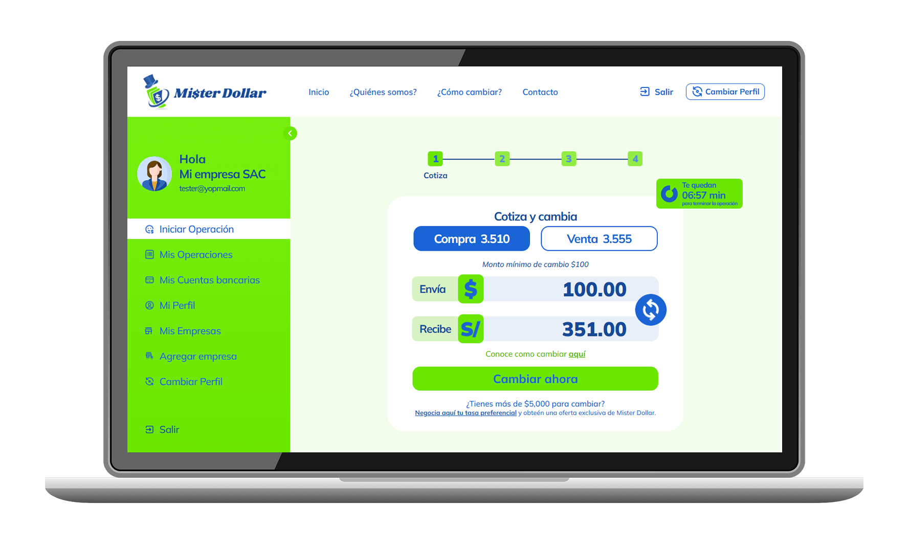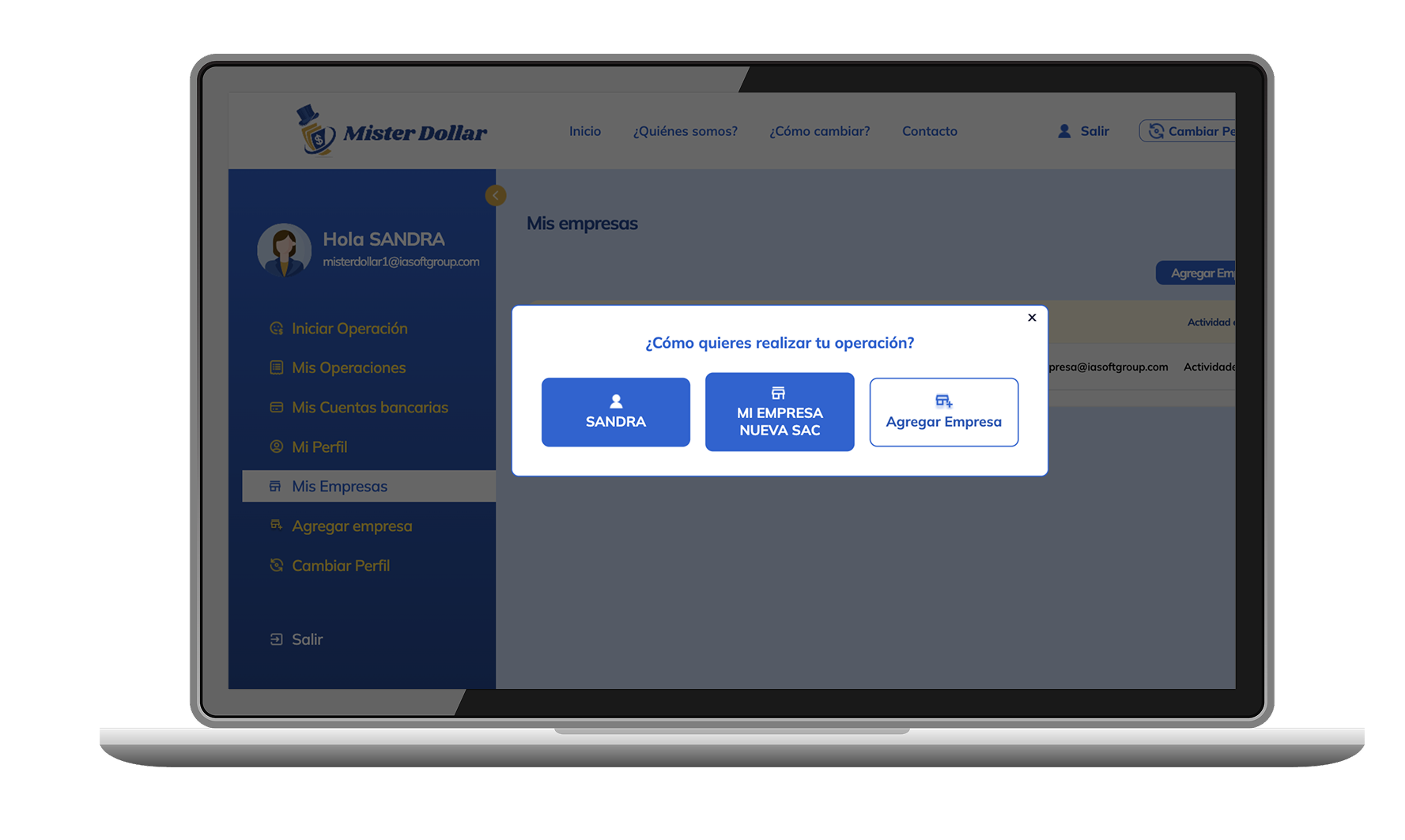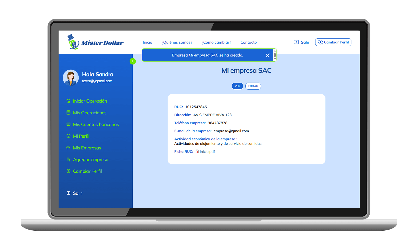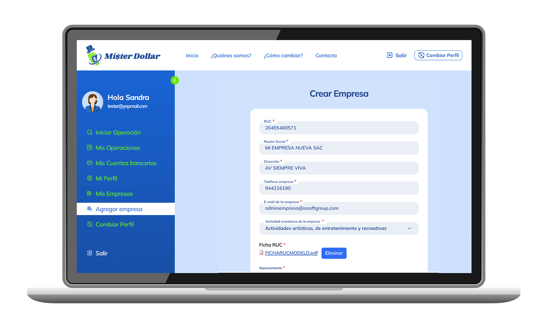 Si deseas cambiar como empresa, pero para ello primero debes crear o agregar tu empresa, en el menu de la izquierda, Agregar Empresa, debe ingresar datos reales de tu empresa, ya que serán validados.