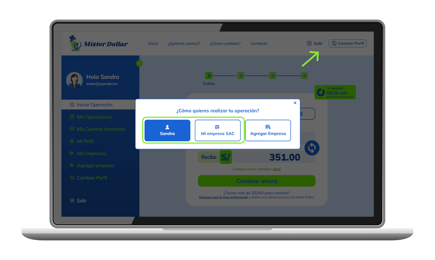 Si seleccionar cambiar como persona natural (ejemplo SANDRA), debes calcular y poner el monto a cambiar en la calculadora.